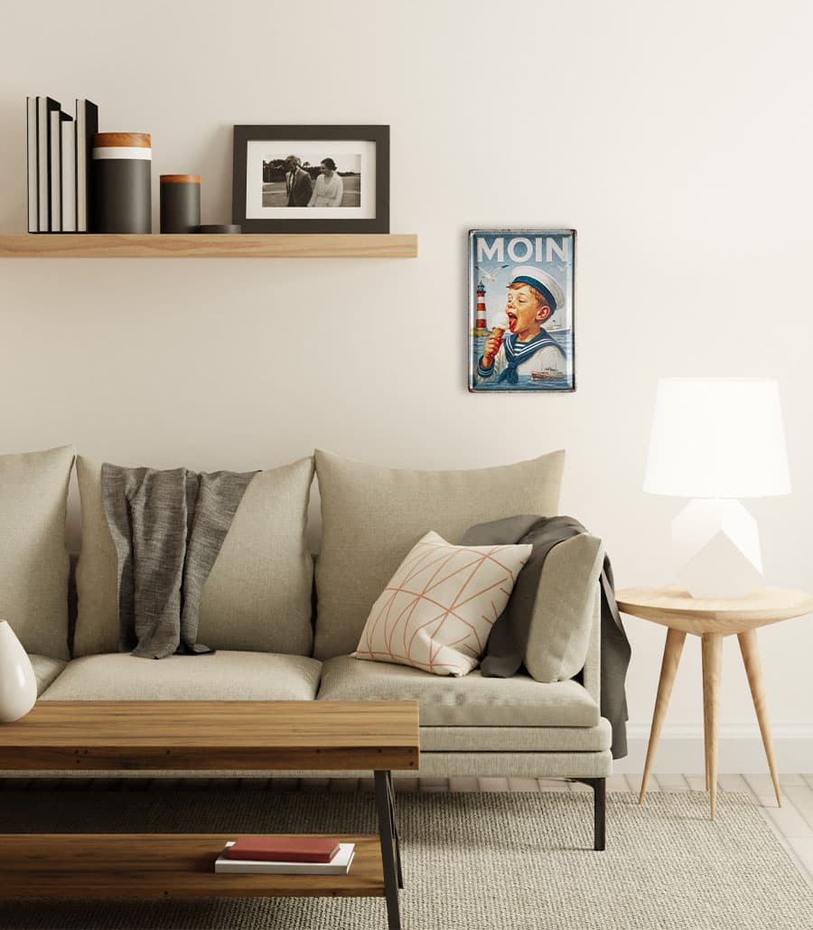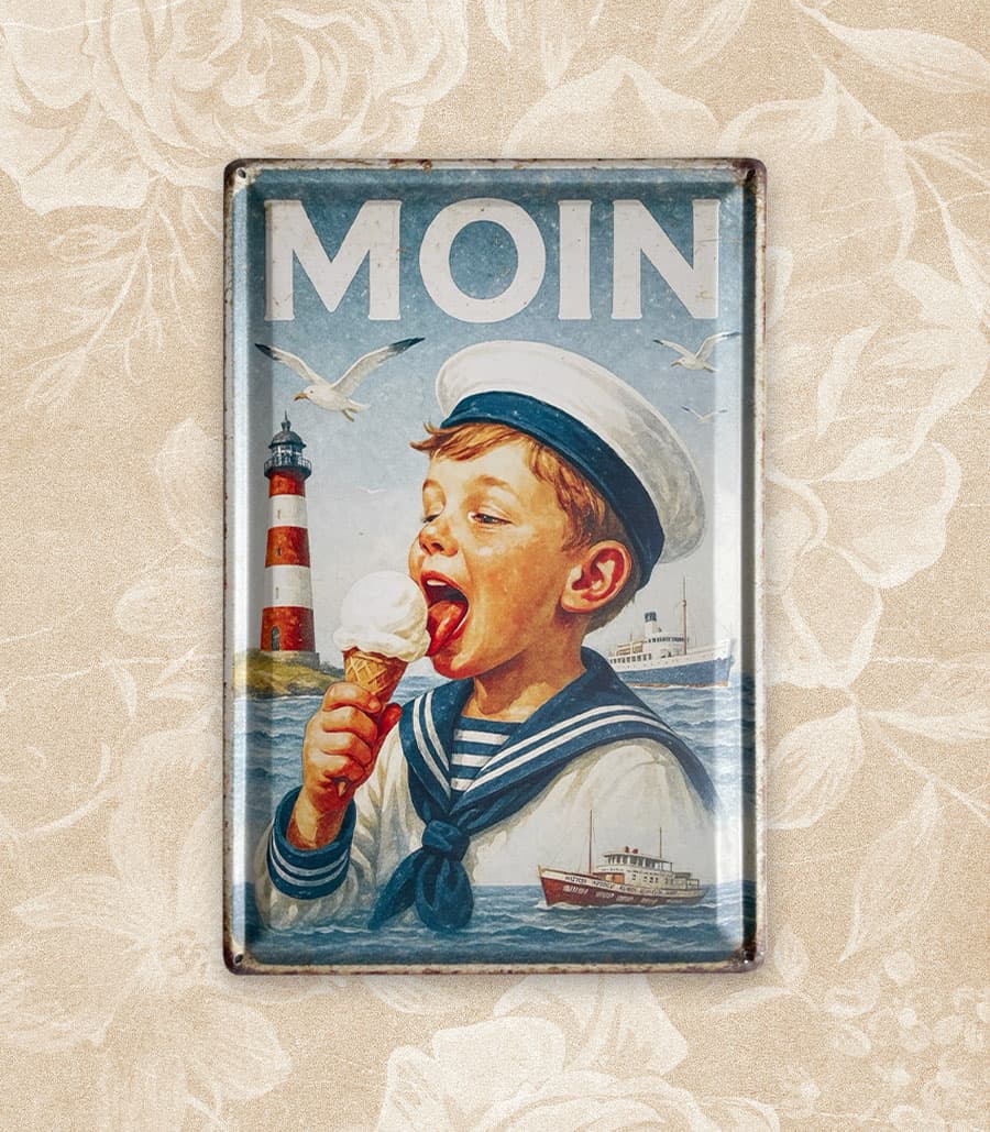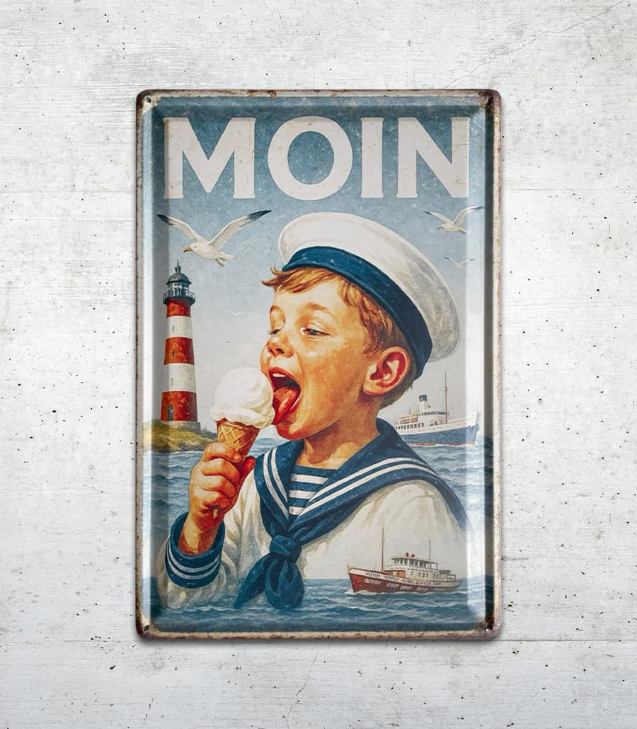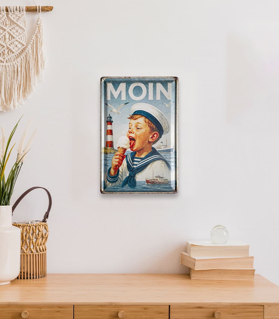 Das geprägte Blechschild „MOIN“ bringt sofort Nordseeluft in dein Zuhause. Ein fröhlicher Matrosenjunge mit Eis, ein roter Leuchtturm und vorbeifahrende Schiffe – dieses Motiv verkörpert die ganze Leichtigkeit und Lebensfreude der Küste. Durch die hochwertige Prägung wirkt das Bild plastisch und lebendig, während die angedeuteten Rostränder dem Schild den typischen Retro-Charme verleihen.